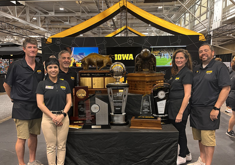 Staff Council members passed out swag, rolled thousands of Iowa Football posters, and answered questions from some of the thousands of fairgoers passing by the booth in the southwest corner of the Varied Industries Building. The booth featured a life-sized Herky statue and several championship trophies from the past year, including the Heartland Tro;phy and the Iowa Women's Big Ten basketball championship trophy. Council members were on hand for a couple of special visits – Iowa Men's basketball great and former NCAA basketball player of the year, Luka Garza, and Herky.
