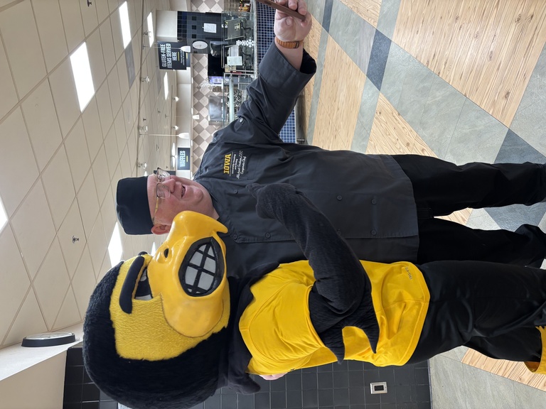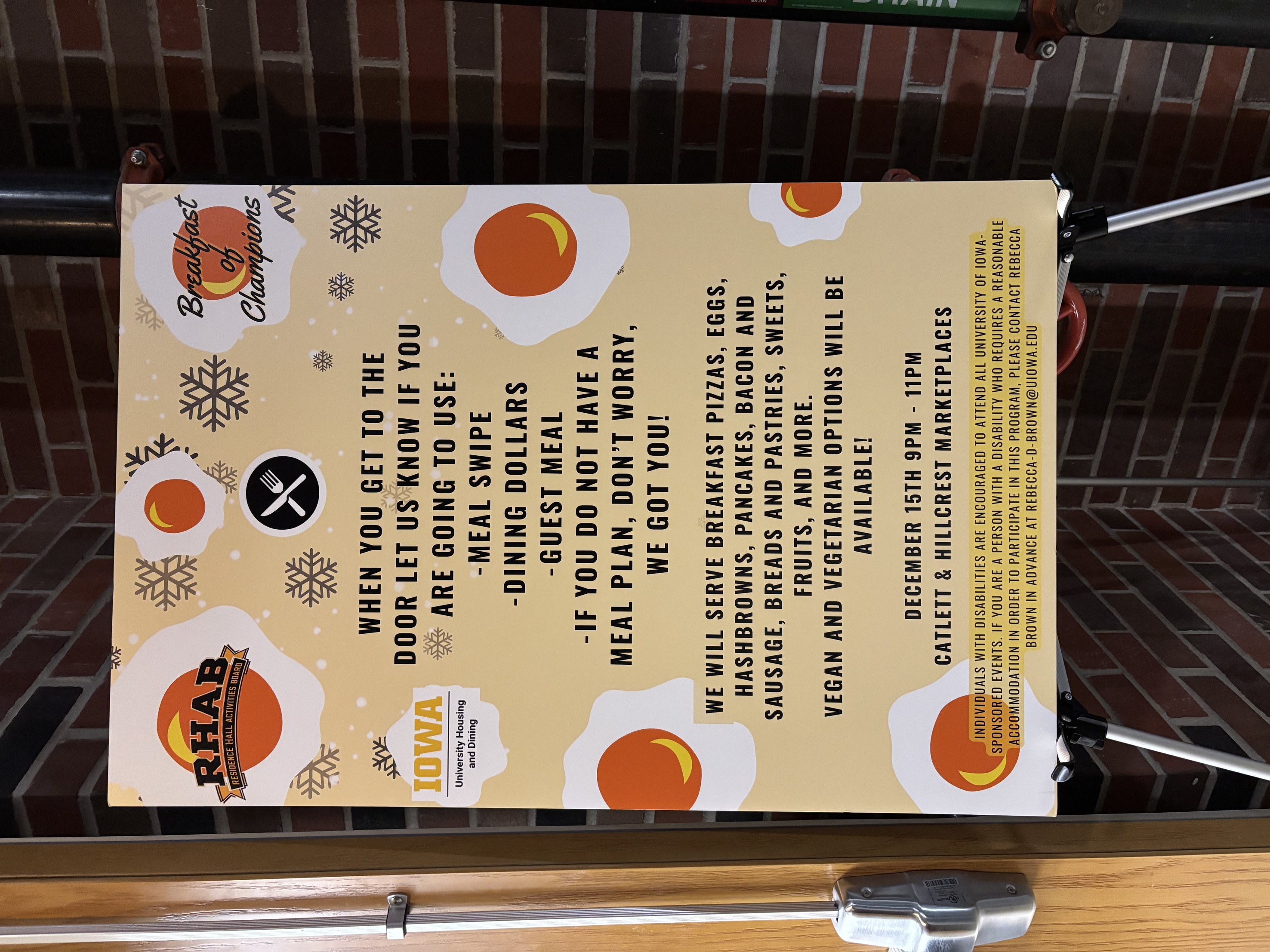 The Residence Hall Activities Board hosted the Breakfast of Champions at Catlett and Hillcrest Marketplaces, one of many activities supporting Iowa students during Finals Week. Staff councilors joined other UI staff volunteers to kick off exam week by welcoming and engaging with students, and helping serve breakfast treats at this popular event.