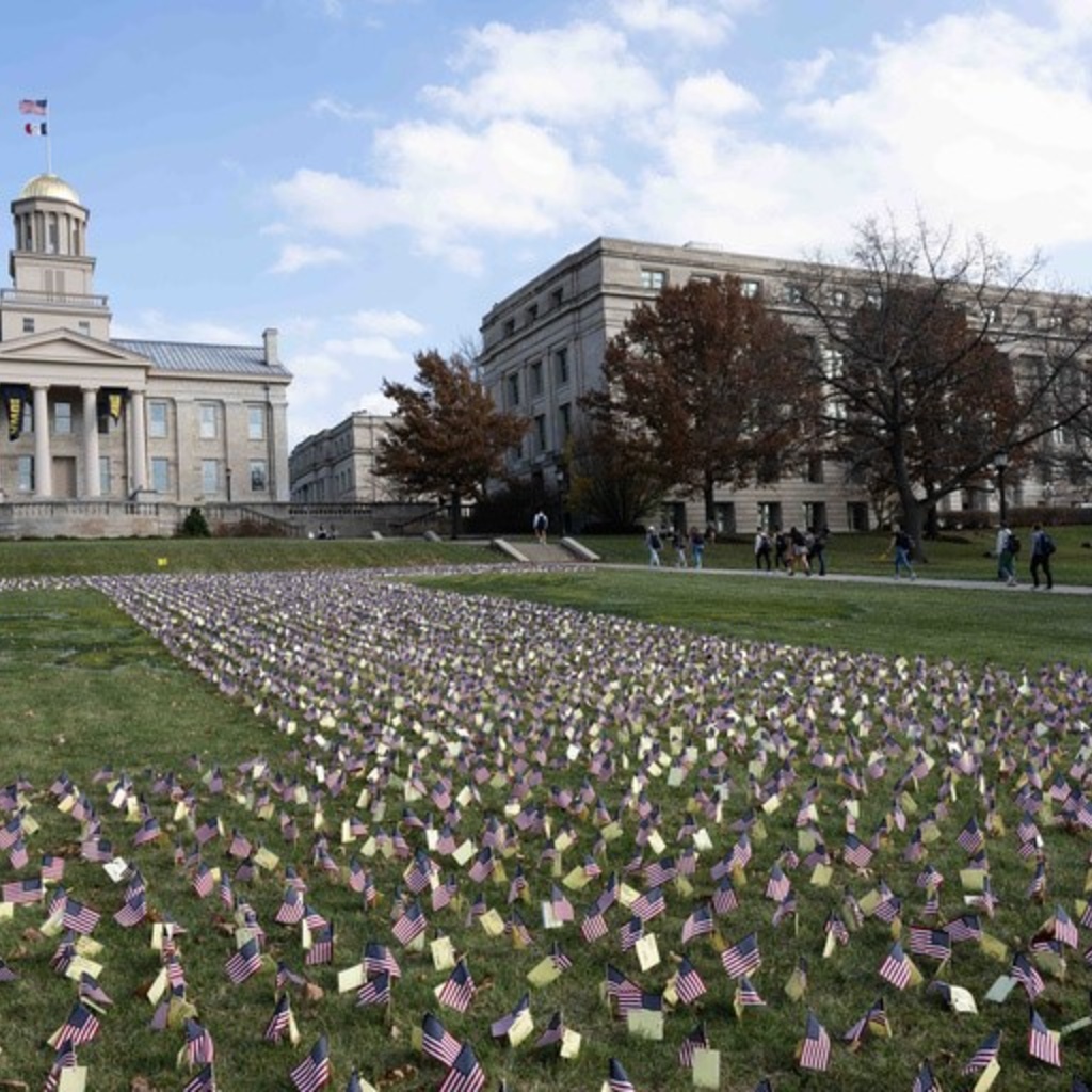 UISC Councilors and other UI associated volunteers helped set-up the yearly display of flags on West Pentacrest; each flag placed is in honor of a veteran with over 6,000 flags displayed this year.